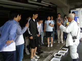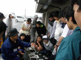 朝から雨でした。雨天の磯での生き物観察は怪我つき物です。時々大怪我をする場合がありますので中止にすることがほとんどです。最初に磯での怪我について予告しておいた効果でしょうか一人もけが人が出ませんでした。雨の中、高校生たちは、雨具を付けずにずぶぬれになり活躍しました。