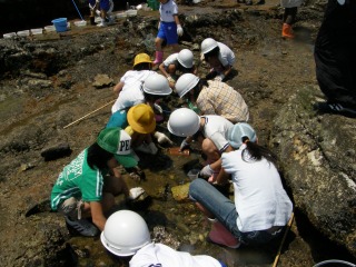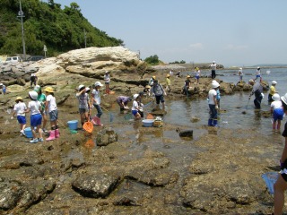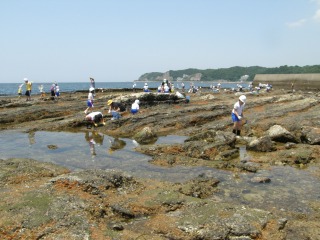 全体に海の生き物についての注意をした後、4グループに分かれて思い思いの場所で海辺の生き物を観察しました。