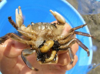 【左】イワガニに寄生したウンモンフクロムシ。着生したムラサキイガイ(黒)