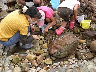 【左】生き物の採り方を説明        【中】大物を狙っています。        【右】カニさんが石の下にいました。