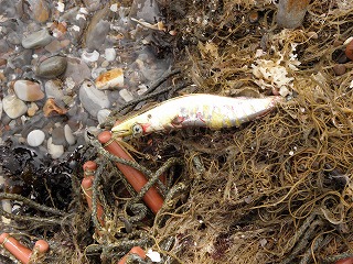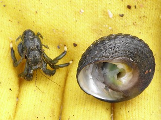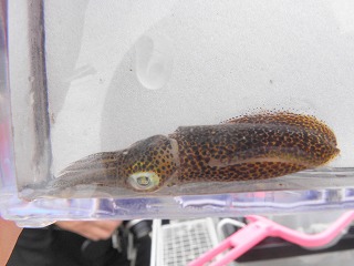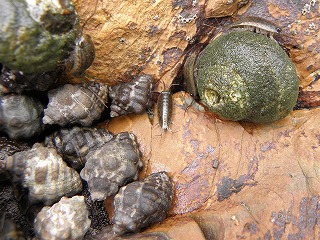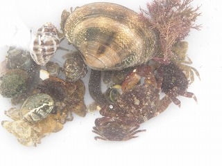 【左】アオリイカの子ども       【中】イボニシ(左)とスガイ中間にフナムシ          【右】カリガネイガイ