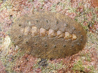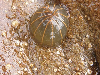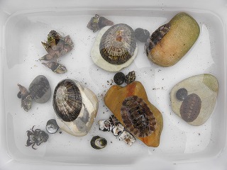 【左】ケハダヒザラガイ?     【中】参加者が採集した生き物。マツバガイ、イボニシ、スガイ、ヒザラガイヤドカリなど     【右】参加者が採集した生き物