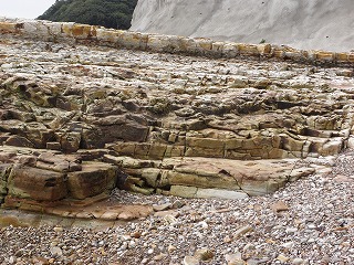 【左】南知多の地層               【右】「えぎ」(餌木)といいアオリイカを釣るための疑似餌と縦網(漁具)