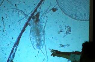 採集したものは施設に持ち込み、水槽に提示しすると共にOHCと顕微鏡撮影装置を使って液晶プロジェクターに掲示し、生き物それぞれについて外来種の取り扱いについて法律を交えて解説を行いました。引き続き使用済みペットボトルを利用してもんどりを作成をしました。