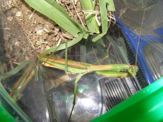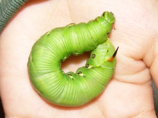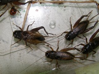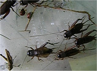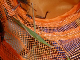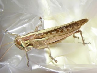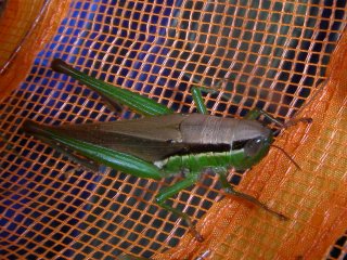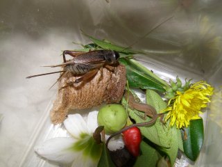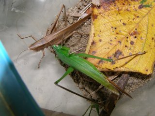 【左】捕まえました。逃がさないように。 【右】クズなどを食べるツチイナゴ。
