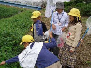 まず、教室で昆虫についてお話をした後、校庭と石ケ瀬川の土手で昆虫を観察し、採集をしました。子供たちはいきいきし、楽しく観察しました。外に出ての活動は多少リスクがあり、しかも時間がかかりますが室内では学べないものがたくさんあります。映像、音響技術がいくら進化しも室内に無数の映写機、スピーカーを備えることは不可能ですし、風や匂いを体感できることは出来ないからです。外に出るとストーリーがなく、たくさんの偶然に出会うことが出来ます。今回も外でたくさんの偶然に出会うことが出来ました。