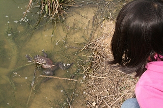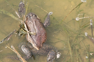 【左】よく見ていたら動き出しました。ウシガエルです。