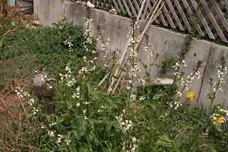 【中】ルッコラ(ルケッタ=ロケット)の花。英語名のロケットとは「糸巻き車」の意味だそうです。ごまの香りがします。