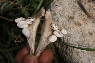 【左】 けものの骨のようです。(コイの咽頭歯(のどの奥にある歯)でした。) 【右】左右ありました。歯はすり切れたのときれいなのがあります。