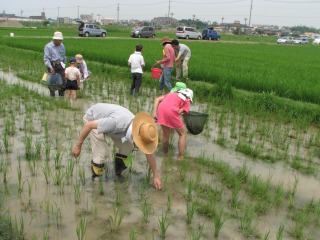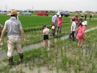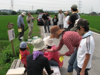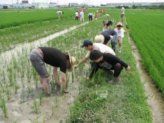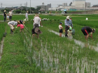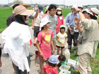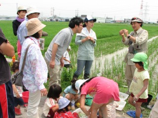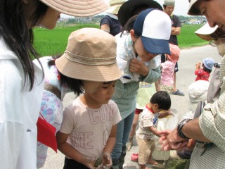 アカトンボの羽化跡は見られませんでしたが、水田にはたくさんの生き物が見られ、たのしい観察会が出来ました。大人の人たちは、水田雑草を除去し、除去した草を水田の泥の中に埋めました。泥の中に埋めることにより、再び稲の栄養になるのです。