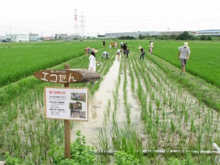 【左】エコたんは周りの水田に差をつけられていますが8月に追いつきます。 【右】生き物探しが始まりました。