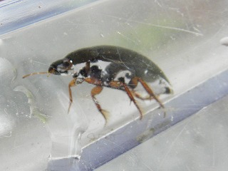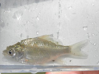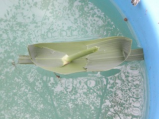 長成池では、観察指導員が胴長を着て池に入り生き物をすくって水槽に入れ、これを皆さんに見ていただくという形で観察会が進められました。テーマの「水辺の生きもの探検」を裏切らせないという指導員の熱血の行動でした。カダヤシ、フナ、トンボの幼虫(ヤゴ)、ミズスマシ、アメンボなどが見られました。熱中症が一番心配でしたが、その発生は無く予定の12時に無事終えました。(記・畠)