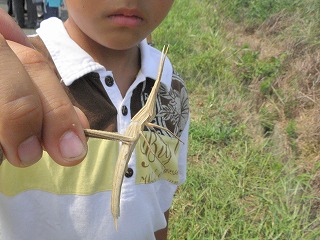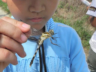 湿地での出来事です。ムギワラトンボ?が人が近づいても手を出しても逃げないのを少女が気付きました。そして指に止まったのをみんなに見せました。皆が手を出したところ逃げずに他の人の指にも止まり皆を喜ばせました。遅まきながら写真を撮ろうとリュックから写真機を取り出しているうちに飽きたのでしょうか他の草に止まってしまいました。それからはいくら指を出しても逃げはしないのですが指には止まらなくなってしまいました。一人の保護者が写真を撮っていたようなのですが撮れたかどうかわ確認しませんでした。3組のメンバーで親子2人でしたのでメンバー表で調べれば分かると思います。私自身の解釈でここでは生き物を誰もいじめないので人を怖がらないのではと説明しました。私の家の庭に来るシオカラトンボも静かに指を出すとときには止まることもありますから習性だとは思いますが、6人もの人間に囲まれても逃げないのは初めての経験で感動しました。しばしばあることでしたら没にして頂くとしてもしも珍しいことであるならお伝えしたくてメールしました。