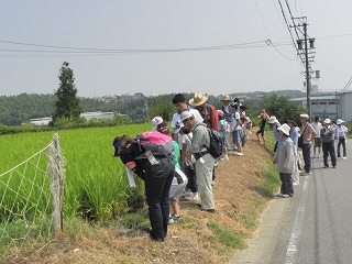 【左】道中で生き物観察  【右】水田の生き物を覗く