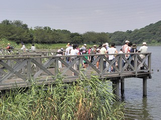 常滑駅からと武豊駅からバスで、或いは直接会場へと集まった参加者53名を1〜5組(A班)、6〜9組(B班)に分け、各組に指導員が1名ないし2名がついて、A班は壱町田湿地――長成池へ、B班は長成池――壱町田湿地の順に観察を行った。