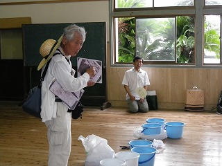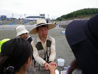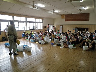 「海辺の危険な生きものと注意事項(森田博)」を説明し、各家族にタモ網・金魚タモ網、バケツを貸与した後