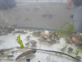 皆が採集に勤しむ間に、門脇さんには水槽水族館を設営して頂き、展示された魚類、エビ類等に参加者の