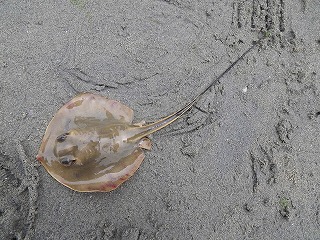 【右】尾部の針で刺す危険な生物 アカエイ(幼魚の死骸)