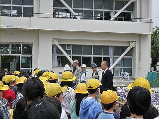 【左】天気がいい中、整列 【右】校長先生のお話