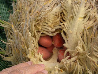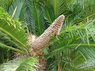 【左】ソテツの実(雌株) 【中】ソテツの雄花の後(雄株) 【右】アサギマダラが訪れるヒヨドリバナ