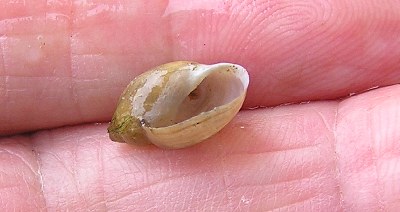 【左】サカマキガイの殻です。ヨーロッパ原産の外来生物で汚れに強く、水槽の掃除もしてくれます。