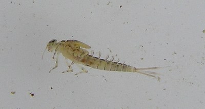 【左】汚れた水にすむ、サホコカゲロウです。たくさん発生し、魚の餌になります。