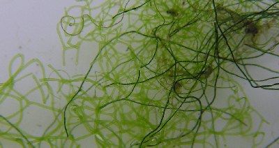 【左】色の薄いのはアミミドロで濃いのはアオミドロでしょうか。緑色の植物が増えると水の浄化し、酸素を出してくれます。