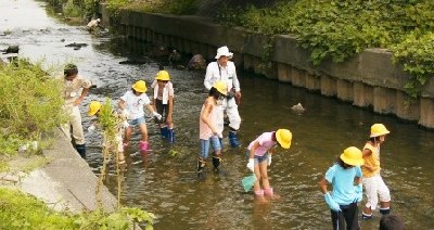 【右】上流に向かって採集をしました。