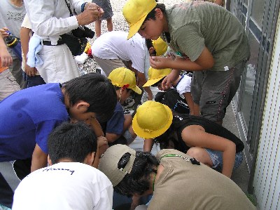 【左】採集した生き物を観察しています。