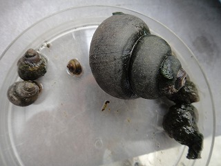 【左】ヘイケボタル幼虫 約500匹放流 【中】幼虫の餌、ヒメタニシ、オオタニシ 【右】カキツバタ(開花)