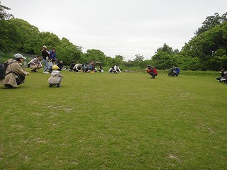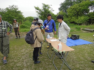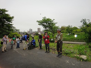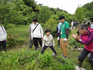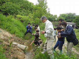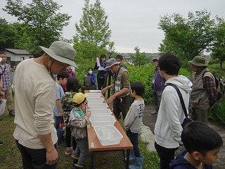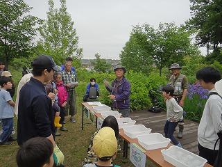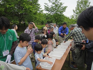 【左】スタッフ紹介 【中】生きもの体操 (長谷川講師) 【右】ヘイケボタル幼虫展示会場