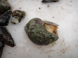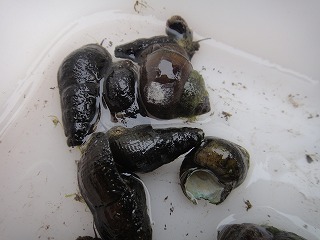 【左】ヘイケボタル幼虫 【中】タニシ 【右】カワニナ