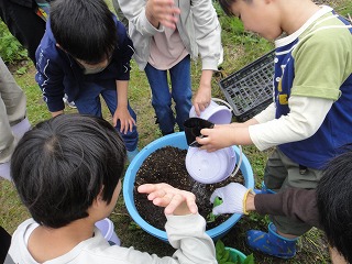 【左】土づくり 【中】フジバカマポット苗作り 【右】
