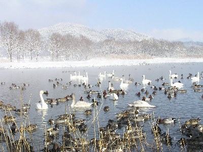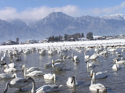 【左】南安曇郡穂高町狐島の水田に水を張り、白鳥に餌を与えています。