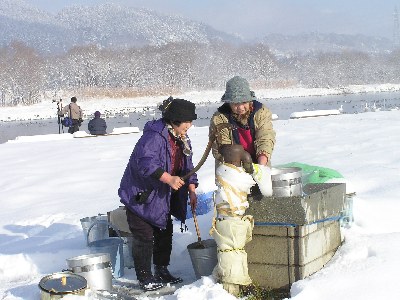 【右】準備から片付けまでお世話していただいた「御宝田白鳥の会」の婦人部の方です。突き井戸からは13℃の水が出ます。