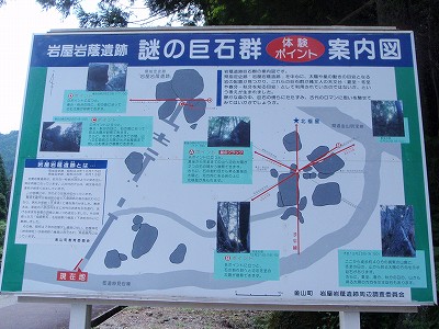 【左】遺跡の案内図 【右】前方の車の右の高い木の下に見つけた