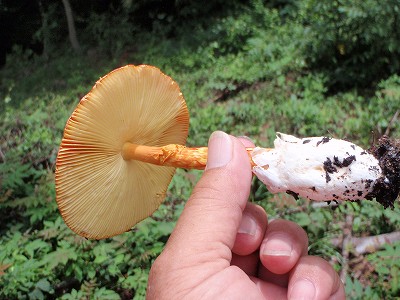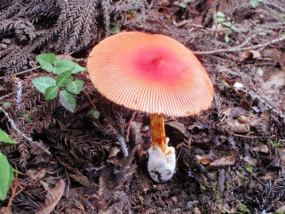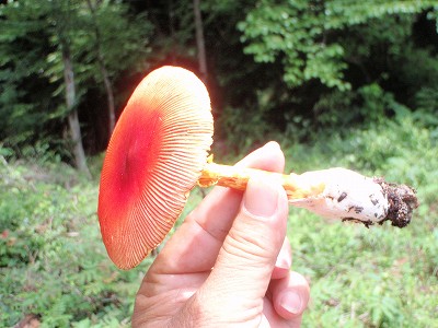 岩屋岩陰遺跡(岐阜県下呂市金山町岩瀬にある巨石で構成される遺跡。岩屋ダムの近く)に立ち寄った際、路傍に物凄く目立つキノコを見た。これだけ特色があれば種名も判るだろうと思い写真に収めた。結果は「タマゴタケ」であった。見たときは明らかに毒キノコと思ったが図鑑によれば美味しいキノコとのこと(傘が開くと味が落ちるともあった…)。分布からすれば知多半島にもあってもよいのに見たことがない。森林の規模が小さいので発生が無理なのか…と勝手に解釈している。