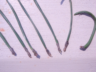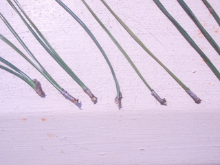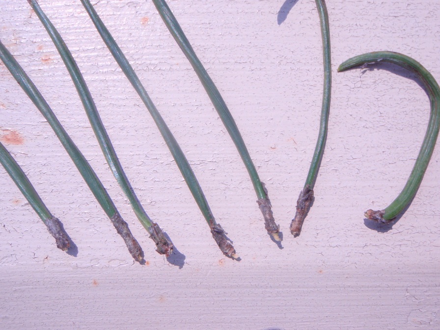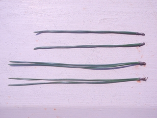 クロマツの2針葉との比較写真をと思って標準的な2針葉を選んでいたら、1針葉や3針葉が混ざっていた。これも初めてのことでびっくりした。ちょうど、シロツメクサの三つ葉の中で四つ葉を探すような作業だった。どんなものでも標準以外の変わりモノがあるものだと再認識(痛感)した次第でした。