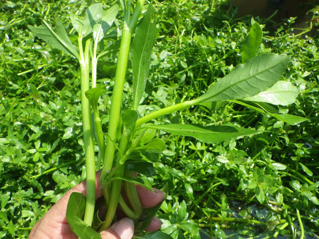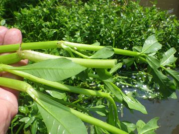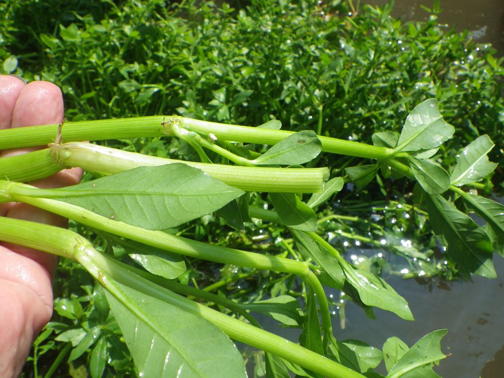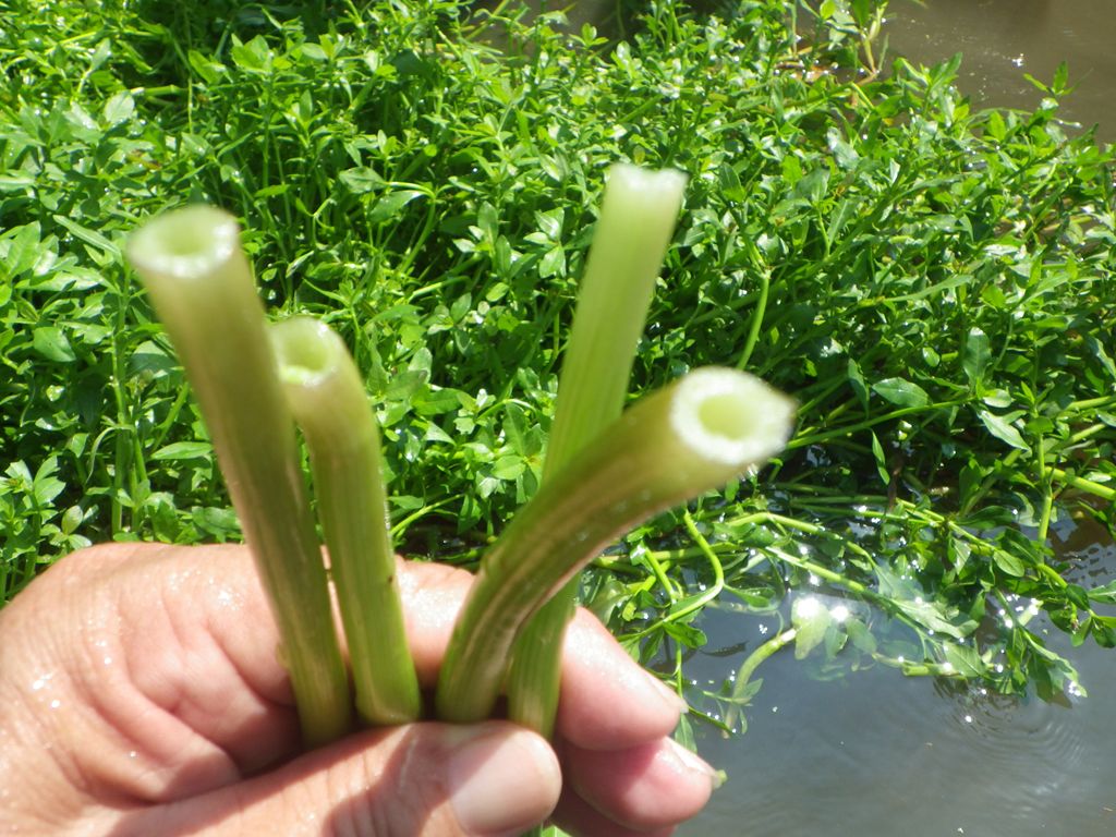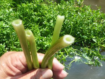 【左】茎は空洞   【右】水中の茎。節(ふし)ごとに根が付いている