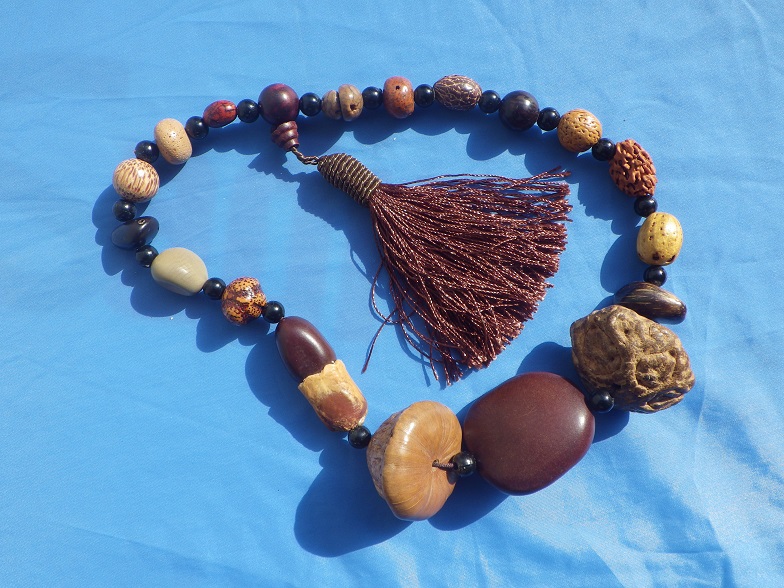 【左】緬茄…会員の作品 【中】数珠の一部に使われていた緬茄。右端は左の作品と同一 【右】数珠…中国で買ったもの