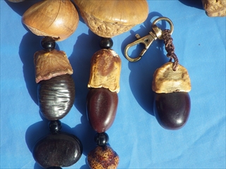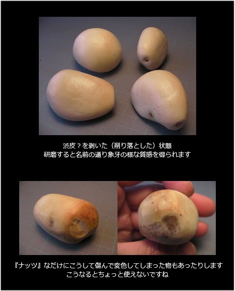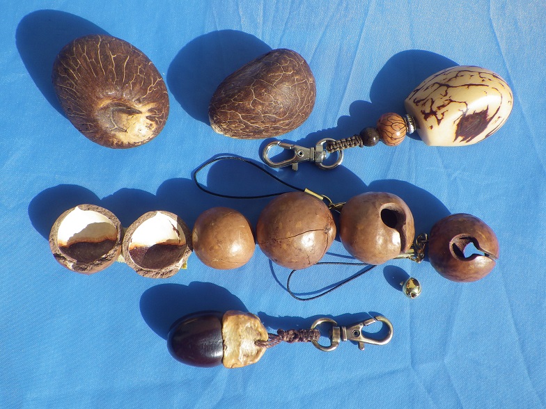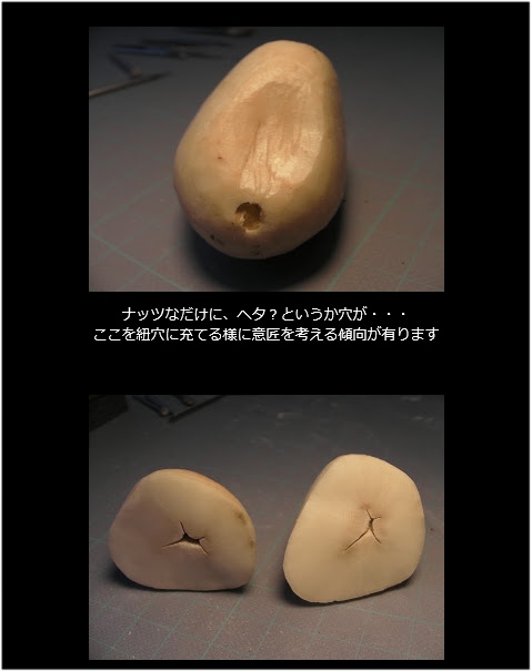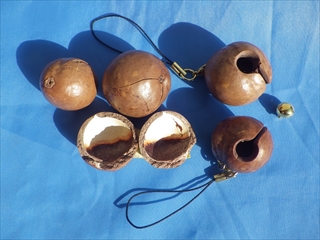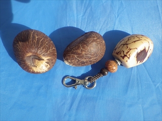 【左】話題になった木の実の細工物。 上段…象牙椰子。中断…マカダミアナッツ。 下段(1ヶ)…緬茄