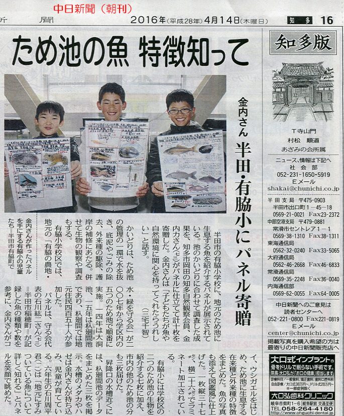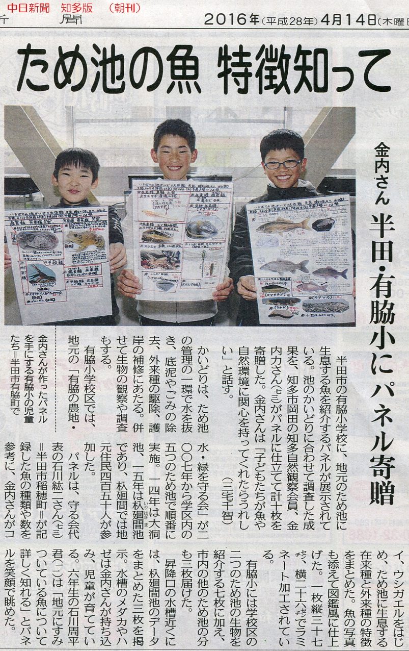 本日(2016.4.14)、中日新聞(朝刊)知多版のトップに知多自然観察会々員金内氏の下記記事がありましたので紹介します。