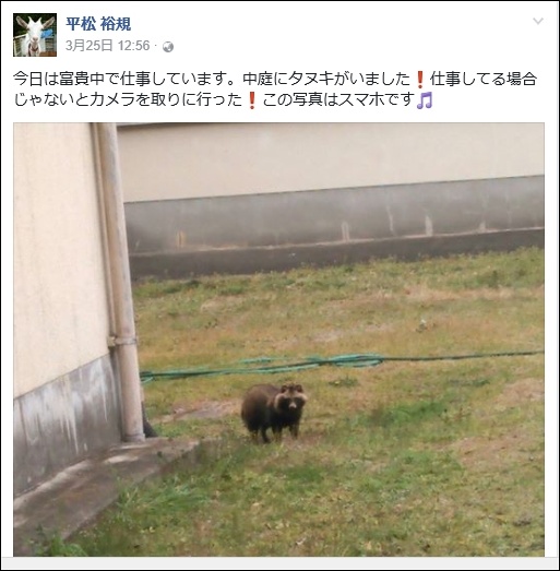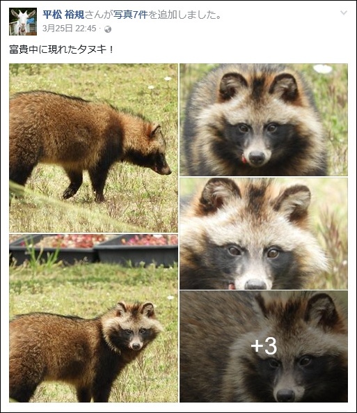 下記掲載の画像等は、会員の平松裕規氏のフェースブックへの投稿画像です。 本日深夜、久しぶりに見ていたらありました。 タヌキが明るいうちに出てきて、人を見て、さっと逃げるでもなく、写真を撮らせるというのは、私にとっては、まったく想定外のことです。 フェースブックでお友達づきあいしている会員はすでにご覧済みでしょうが、いい写真だったので、皆さんにもと思い、連絡します。 ※ 私にもこんなチャンスがあったらな…って思う次第です。