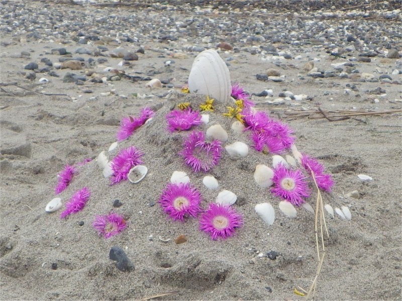 【上の1枚】小さな女の子が造ったバクヤギク飾りの砂山