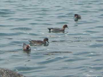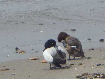 【左】ヒドリガモが漂流ゴミをつついていた 【右】キンクロハジロの夫婦が波打ち際で毛繕い