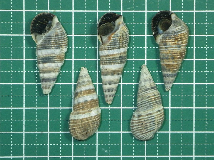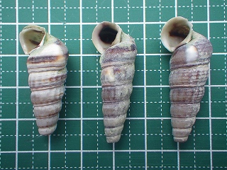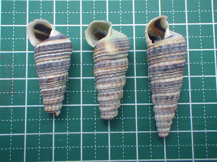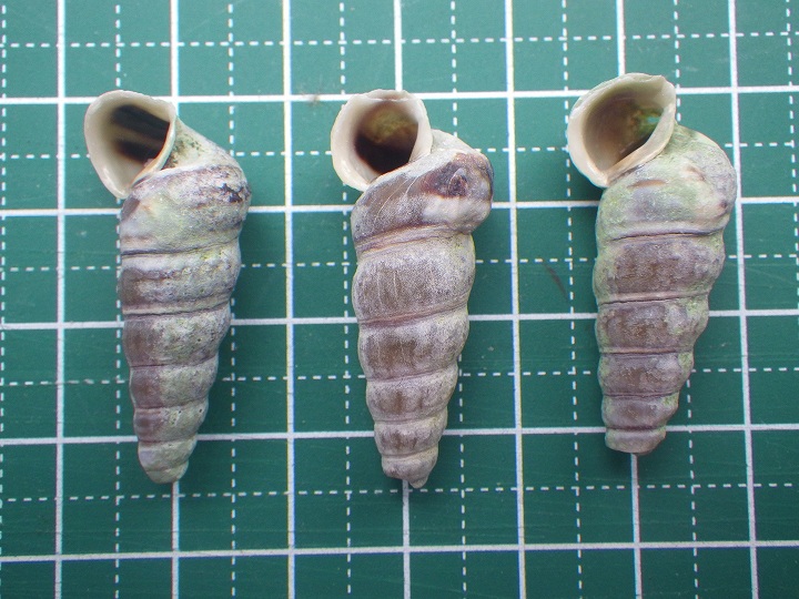 【左・中・右】帰宅後にチェック。採集した巻貝は、すべて フトヘナタリ ※すべて別々の個体
