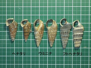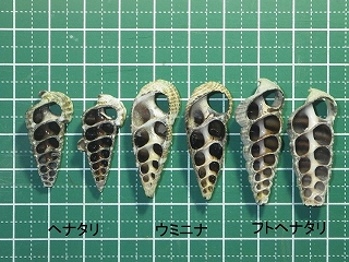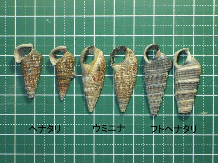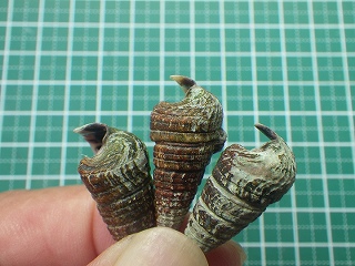 <最後の写真=殻の内側=について-補足> 煮たもモノの中身を取り出そうそして引っ張たり吸い出したりしたが、全くダメだった。 写真はその原因を調べるため切り開いたもの。 結論は、引っ張たり吸い出したりでは絶対に取り出せない…と確信。 と言うのは、 殻頂(とがった先っぽ)まで、しっかり、ぎっしり、身が詰まっているのを見て、無理と確信。 ※ヘナタリとウミニナは幾つかうまく出来た…っと思っているが果たして?
