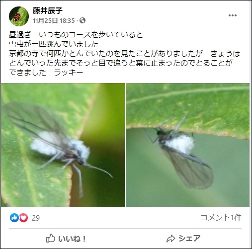 会員の藤井辰子氏が"雪虫"をご自分のFB(フェースブック) にアップしました。(2020.11.25 アップ)