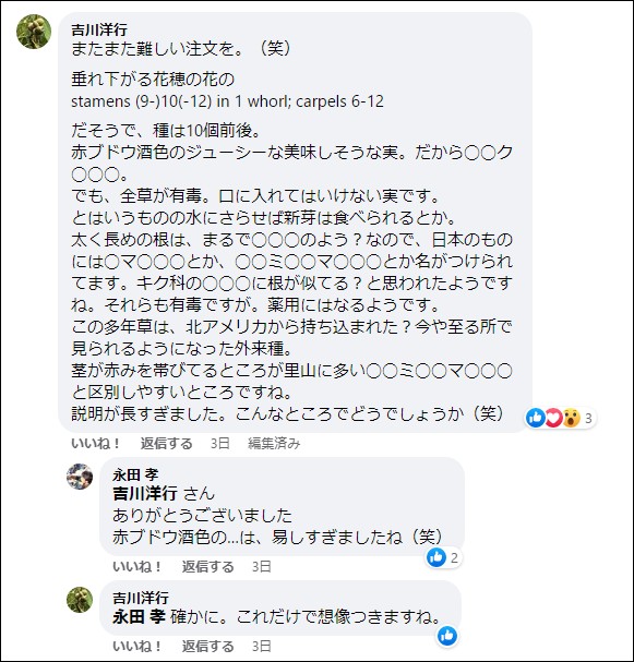 次の2枚の画像は当日のフェースブックからのコピーです。永田氏がアップした際に、同じく会員の吉川洋行氏に "ヒント" をお願いし、それに応えて吉川氏がヒントを投稿したという画像です。(もとより、本会の会員以外の方が沢山コメントを寄せてますがそれは省略です)